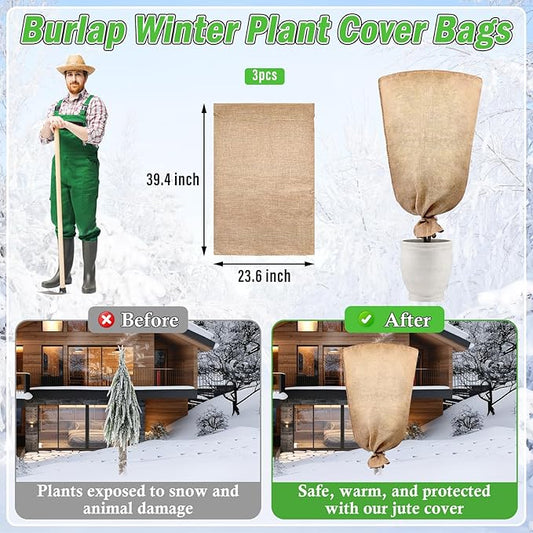 Legigo 3 Pack 24 X 40 Inch Burlap Plant Covers Freeze Protection Bags, Winter Plant Frost Covers with Drawstring, Reusable Tree Covers Burlap Frost Cloths Protection for Outdoor Plants Shrubs Fruit