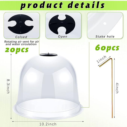 20 Pack Garden Cloche Plant Dome 10.2 D x 8.3 H Plant Cover Plastic Humidity Dome Reusable Plant Protector Mini Greenhouse Dome Plastic Plant Bell Cover with Ground Securing Pegs for Outdoors Plants
