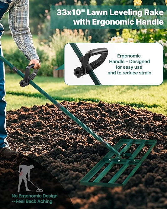 Lawn Leveling Rake 33x10'', Yard Leveling Rake with 78'' Back-Saving Adjustable Handle, Stainless Steel Lawn Leveler Tool for Garden, Backyard, Farm, Golf Course