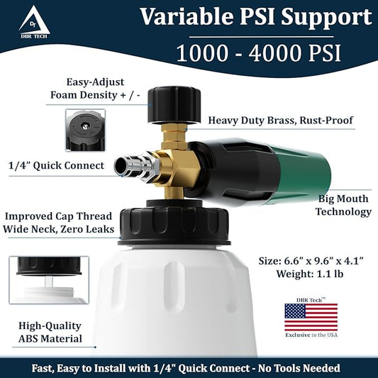 Foam Cannon for Pressure Washer, 1.1mm Orifice, 1000-4000 PSI, 1/4 Inch Quick Connector, Wide Neck and Adjustable Spray, Heavy Duty Car Snow Foam Blaster for Superior Foaming & Deep Clean, Green