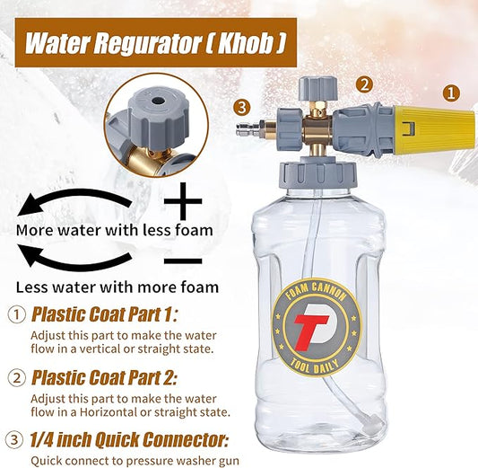 Tool Daily Foam Cannon for Pressure Washer with Dual Connector Accessory, Adjustable Soap Cannon with M22-14 and 1/4β Quick Connect Fittings, Additional Orifice Nozzle 1.1mm, 1.5 Liter