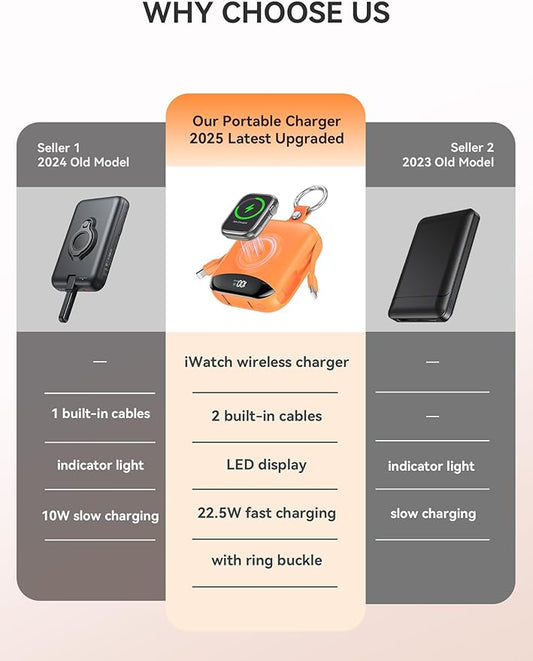 Portable Power Bank, 10000mAh 22.5W Fast Charging Phone Charger with Built-in Cables, Travel Essential Battery Pack with LED Display, Keychain Battery Bank for iPhone, iWatch 10/9/8/7/6/SE/5/4 Orange