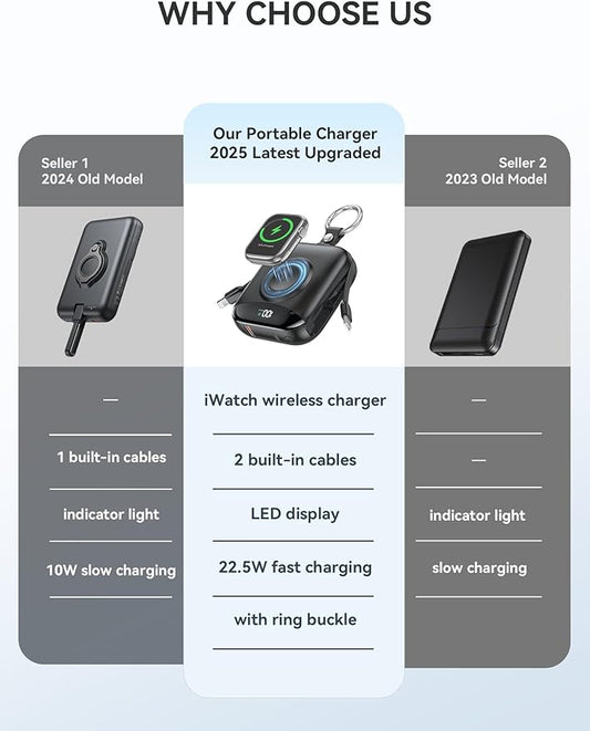 Portable Charger Power Bank, 10000mAh 22.5W Fast Charging with Built-in Cables, Travel Essential Battery Pack with LED Display, Keychain Battery for iPhone, iWatch 10/9/8/7/6/SE/5 Black