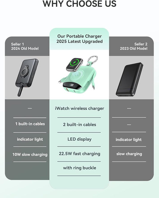 Portable Power Bank, 10000mAh 22.5W Fast Charging Phone Charger with Built-in Cables, Travel Essential Battery Pack with LED Display, Keychain Battery Bank for iPhone, iWatch 10/9/8/7/6/SE/5/4 Green