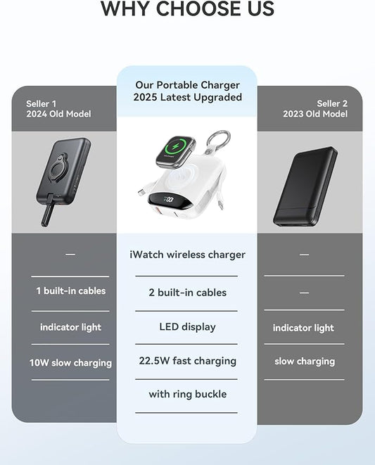 Portable Power Bank, 10000mAh 22.5W Fast Charging Phone Charger with Built-in Cables, Travel Essential Battery Pack with LED Display, Keychain Battery Bank for iPhone, iWatch 10/9/8/7/6/SE/5/4 White