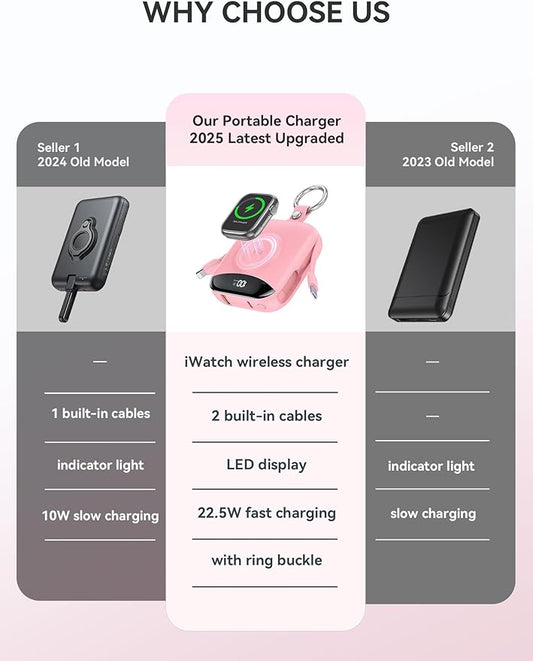 Portable Charger, 10000mAh 22.5W Fast Charging Power Bank with Built-in Cables, Travel Essential Battery Pack with LED Display, Keychain Battery Phone Charger for iPhone, iWatch 10/9/8/7/6/SE/5/4 Pink