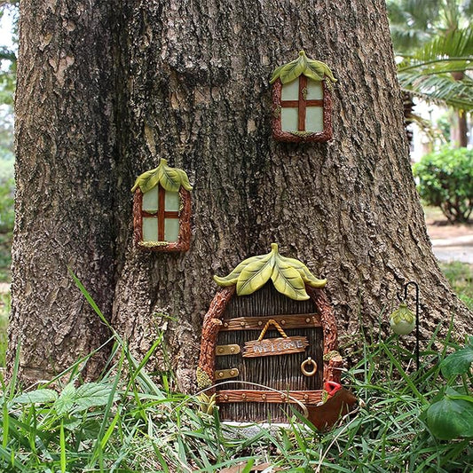 Fairy Door and Windows Garden Kit Accessories Outdoor, Glow in Dark Gnome House for Tree, Lawn Yard Art Sculpture, Miniature Garden Decor (Leaf)