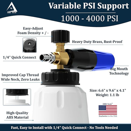 Foam Cannon for Pressure Washer, 1.1mm Orifice, 1000-4000 PSI, 1/4 Inch Quick Connector, Wide Neck and Adjustable Spray, Heavy Duty Car Snow Foam Blaster for Superior Foaming & Deep Clean, Blue