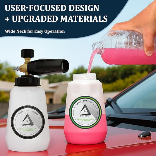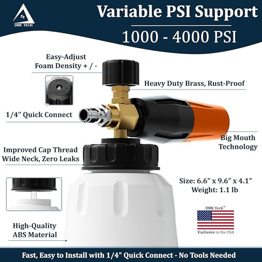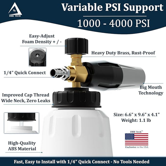 Foam Cannon for Pressure Washer, 1.1mm Orifice, 1000-4000 PSI, 1/4 Inch Quick Connector, Wide Neck and Adjustable Spray, Heavy Duty Car Snow Foam Blaster for Superior Foaming & Deep Clean, Black