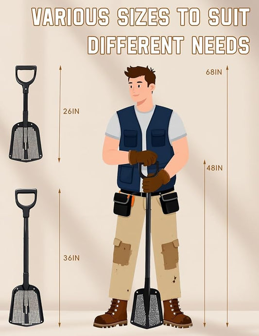 Heavy Duty Sifting Shovel with Adjustable Handle (26"-48") – Metal Sand Sifter Scoop with D-Grip for Chicken Coop, Beach, Farm Goat Stall & Garden Poop Cleaning – Durable Mesh Design