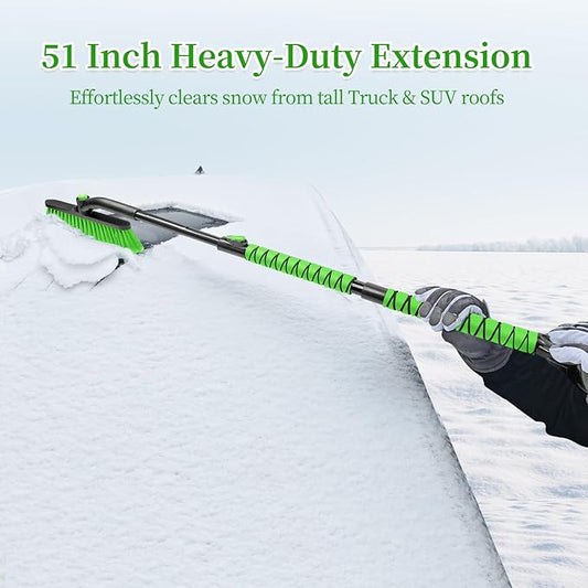 HEEYA 51 Inch Snow Brush for Trucks, Extendable Long Handle Ice Scraper with Brush with Foam Grip, SUV Heavy Duty Snow Brush with Ice Scraper for Car Auto Jeep RV Vehicle Windshield Window - Green