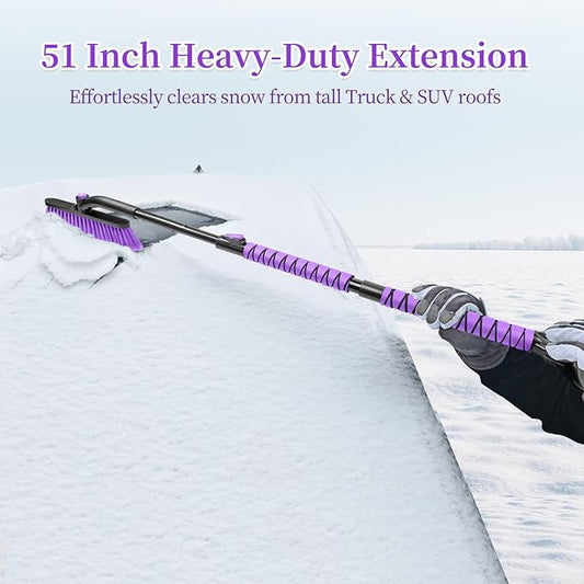 HEEYA 51 Inch Snow Brush for Trucks, Extendable Long Handle Ice Scraper with Brush with Foam Grip, SUV Heavy Duty Snow Brush with Ice Scraper for Car Auto Jeep RV Vehicle Windshield Window - Purple