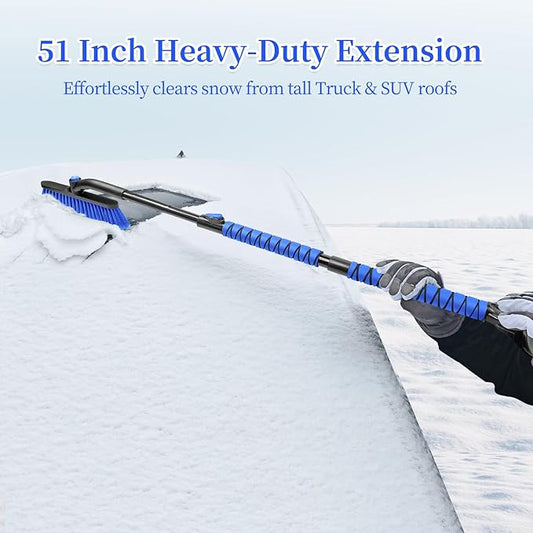 HEEYA 51 Inch Snow Brush for Trucks, Extendable Long Handle Ice Scraper with Brush with Foam Grip, SUV Heavy Duty Snow Brush with Ice Scraper for Car Auto Jeep RV Vehicle Windshield Window - Blue