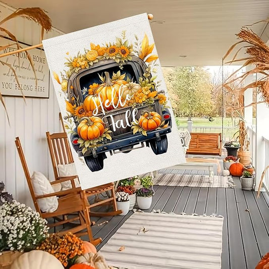 Hello Fall Pumpkin Truck House Flag 28x40 Double Sided, Autumn Thanksgiving Large Garden Flags for Outside, Holiday Seasonal Yard Flag Outdoor Decorations for Home