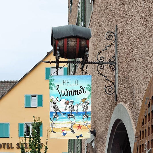 Hello Summer Skeleton Funny Skull Summer Coastal Hawaii Tropical Ocean Garden Flag Welcome Party Outdoor Outside Decorations Picks Home House Garden Yard Decor 12x18 Inch