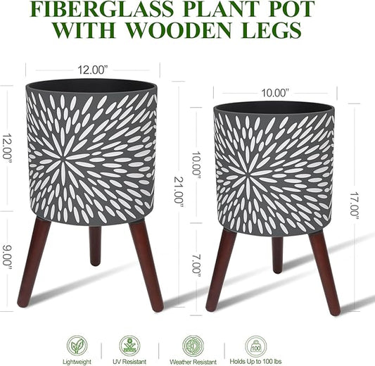 10 & 12 Inches Plant Pot with Stand Set of 2, Large Matte Gray Modern Planters for Indoor Outdoor Plants with Drainage Holes, Big Flower Pots with Wood Legs