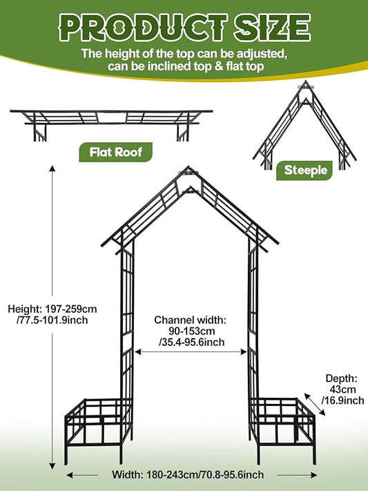 Kalolary 2 in 1 Metal Garden Arbor with Plant Box, 8FT House Shape Garden Arch Trellis for Climbing Plants Heavy Duty Steel Pergola Arch for Wedding Party Backyard Outdoor (Freely Adjustable Width)