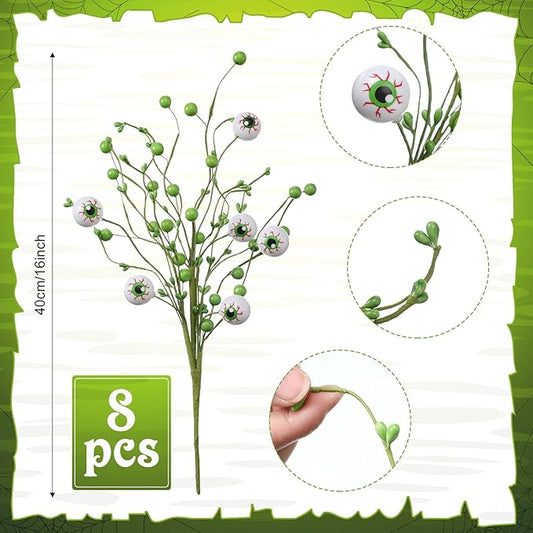 8 Pack Halloween Eyeball Picks Artificial Berry Stems Hlalloween Flowers with Fluorescent Eyeball Branches for Vase Filler, Table Centerpieces & Party Decor
