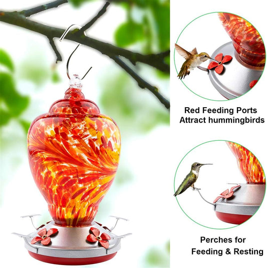 WOSIBO Hummingbird Feeder for Outdoors Patio Large 32 Ounces Colorful Hand Blown Glass Hummingbird Feeder with Ant Moat Hanging Hook, Rope, Brush and Service Card (RED-Firework)
