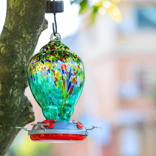 WOSIBO Hummingbird Feeder for Outdoors Patio Large 32 Ounces Colorful Hand Blown Glass Hummingbird Feeder with Ant Moat Hanging Hook, Rope, Brush and Service Card (Green)