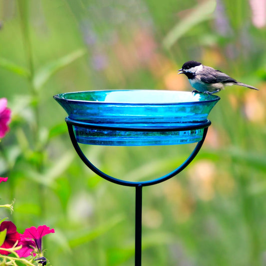 VCUTEKA Bird Bath, Glass Hanging Bird Baths for Outdoors Birdfeeder with 21 inch Rust-Proof Chain for Garden Yard Decor, Blue Daisy