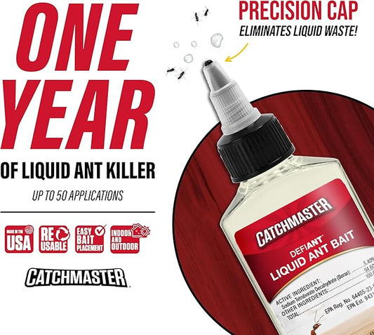 Catchmaster DEFIANT Premium Liquid Ant Killer, 1-Year Supply, Kills the Queen and Colony, No Mess Precision Bottle, Reusable Ant Traps Indoor & Outdoor, Pest Control Traps, Made in USA
