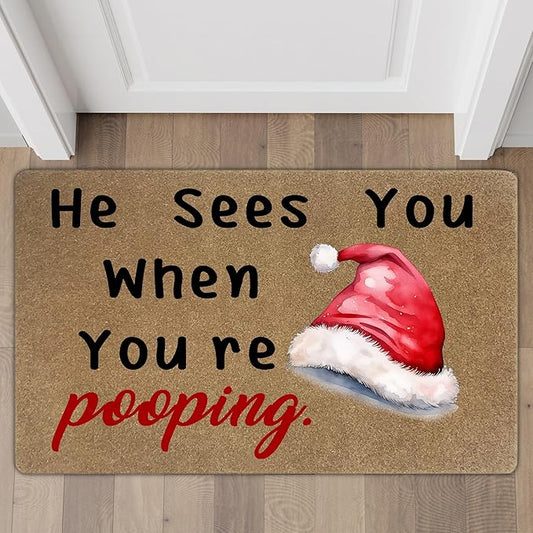 Funny Christmas Bathroom Faux Coir Door Mat, Christmas Bath Mat for Bathroom Entryway, He Sees You When You're Pooping Welcome Doormat for Washroom Restroom Toilet Porch Entrance, 17x30 Inch