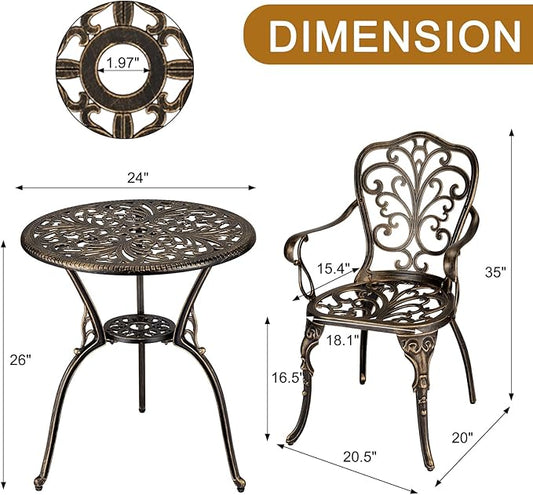 3 Piece Bistro Set, Outdoor Bistro Table and Chairs Set of 2, Rust-Resistant Cast Aluminum All Weather Patio Outdoor Bistro Set with Umbrella Hole for Backyard, Balcony, Front Porch, Brown