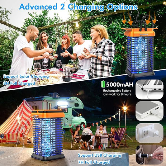 Rechargeable Solar Bug Zapper Outdoor & Indoor, Mosquito Fruit Fly Trap, Gnat Moths Catcher, 4200V Grid, USB Charging, 5000mAh Battery, Fit for Home, Kitchen, Backyard, Camping, Patio