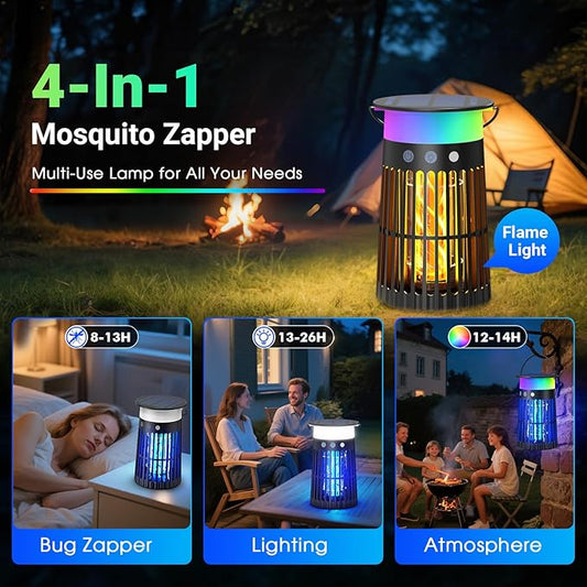 Solar Bug Zapper Outdoor Waterproof, 4 in 1 Solar Mosquito Zapper Outdoor, Cordless Solar Fly Zapper with RGB, Flame Light and LED Camping Lantern