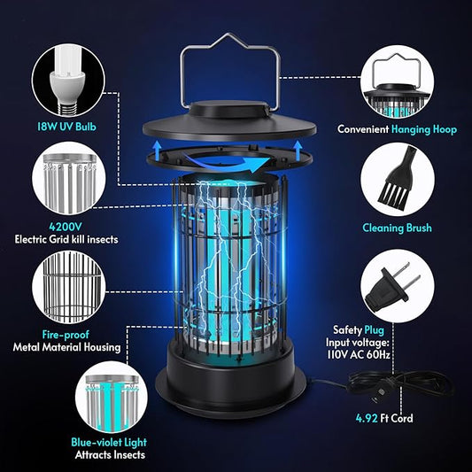Bug Zapper for Outdoor & Indoor, 1/2 Acre Coverage Mosquito Lamp with 18W Bulb & 4400V High-Voltage, 100% Improvement in Mosquito Control Effect, Electric Fly Trap for Patio, Backyard, Home