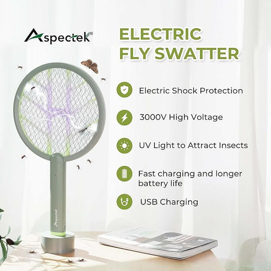 Aspectek 3000V Electric Fly Swatter for Indoor and Outdoor Use, Portable, Rechargeable Bug Zapper Racket with Improved Battery Life, USB Charging Cable, Wall Bracket, White -Green