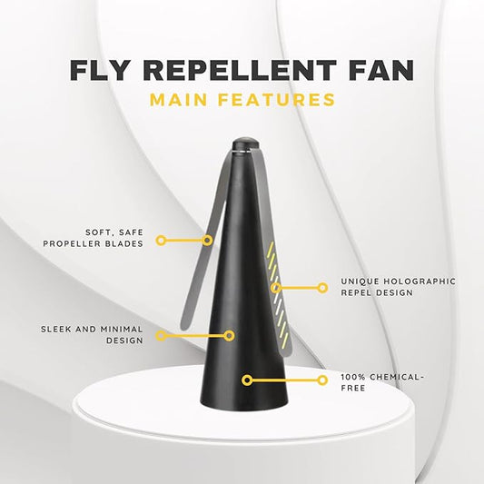 FlyRepellent Fan for Tables – USB Powered/AA Battery Powered, Soundless Fly Swatter with Holographic Blades – Portable Fly Fan for Bees, Wasps & Outdoor Use (1, Black)