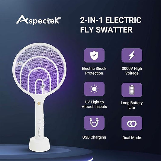 Aspectek 2 Pack Electric Fly Swatter 3000V,2 in 1 Mosquito Zapper, Rechargeable Bug Zapper Racket for Indoor and Outdoor, USB Charging Cable