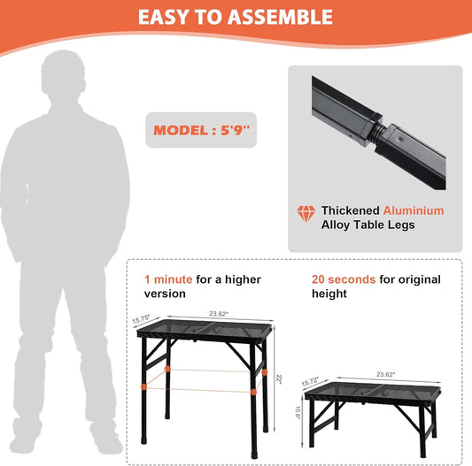 Camping Table with Mesh Desktop, Lightweight & Portable Small Folding Grill Table, Height Adjustable Metal Outdoor Table for Camp, Cooking, BBQ, RV, Picnic-2 FT Black