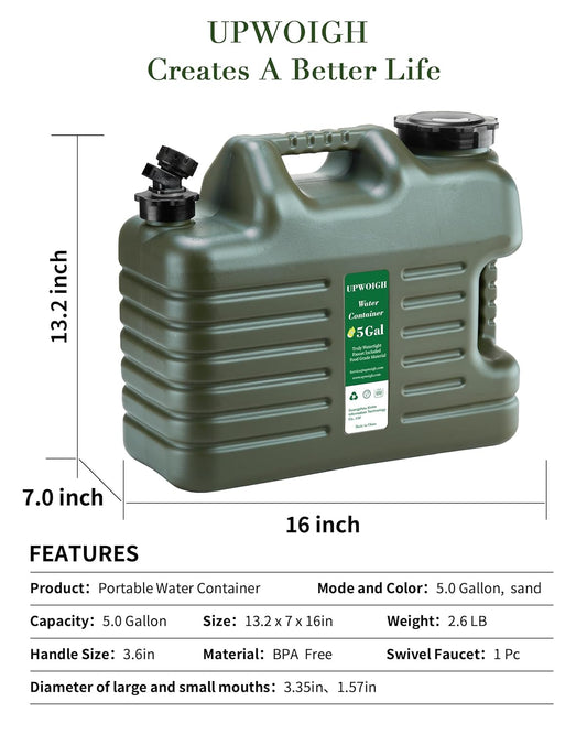 UPWOIGH 5 Gallon Water Jug, Camping Water Container, Truly No Leakage Water Storage with Spigot, Large Military Green Water Tank,BPA Free Portable Overlanding Gear for Outdoors,Hiking