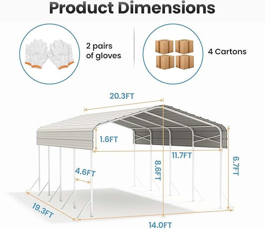 20x20' Heavy Duty Metal Carport – Sturdy Structure, All-Weather Protection, Easy Assembly for Cars, Trucks, Boats, Tractors, and Outdoor Storage (Grey, 20x20FT)