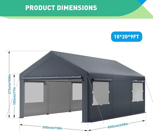 10x20 Ft Heavy Duty Carport, Portable Garage with Sidewalls, Doors, Ventilated Windows, Waterproof and UV Resistant Carport Canopy for Cars, Boats, Suvs, Gray