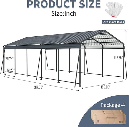 13x26.5 FT Metal Carport, Heavy Duty Car Port Canopy with Galvanized Steel Roof & Frame, Oversized Metal Carport Kit, Outdoor 2 Car Garage, Steel Car Shelter for Car, Boat, Truck, Charcoal