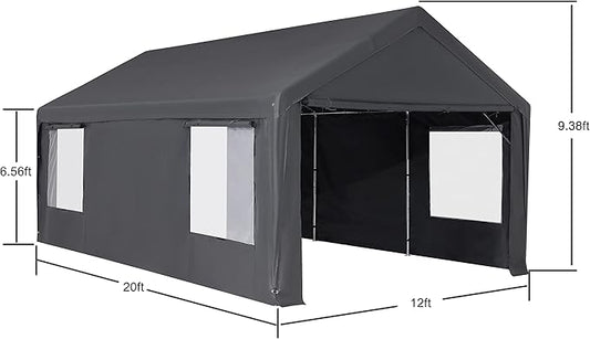 Carport 12'x 20' Portable Garage with Removable Door for Car, Truck, Boat, Car Canopy with All-Season Tarp, Grey