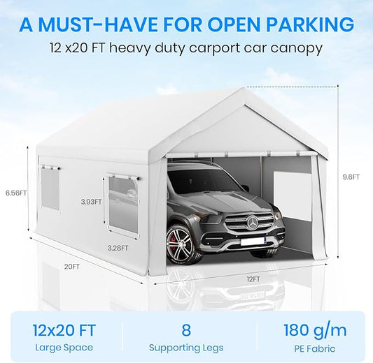 12 x 20FT Heavy Duty Carport with Roll-Up Windows, Portable Garage with Removable Sidewalls & Doors, Portable Car Tent Garage with Roll-Up Windows and All-Season Tarp, for Car, Truck,