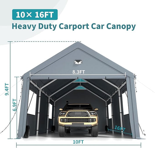 10x16FT Heavy Duty Carport Canopy,Extra Large Portable Car Tent Garage with Roll-up Windows and All-Season Tarp Cover,Removable Roof&Side Wall for Car, SUV,Boats&Truck Shelter Logic Storage