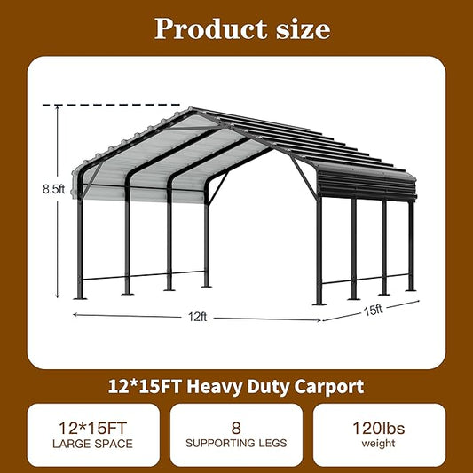 Walsunny Metal Carport 12x15 FT Heavy Duty Carport Canopy with Enhanced Base, Outdoor Car Shelter with Galvanized Steel Roof and Frame Garage for Truck, SUV, Boat, Gray
