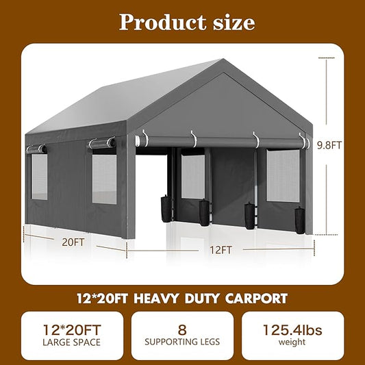 Walsunny Carport, 12x20 ft Heavy Duty Carport Canopy with Roll-up Windows, Portable Garage with Removable Sidewalls & Doors, Car Canopy with All-Season Tarp for Car, Truck, Boat
