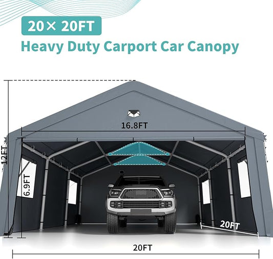 Garvee 10x20 Carport Canopy, Heavy Duty Car Port with Waterproof Tarp, Roll-Up Windows & Doors, Outdoor Portable Garage with Removable Sidewalls, for Car, Boat, Truck, Motorcycle, Grey