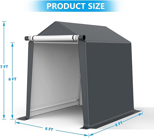 6x8FT Outdoor Storage Shelter Carport, Portable Shelter Heavy Duty Storage Shed Carport with Roll-up Zipper Door for Bike, Motorcycle, Garden Storage, Waterproof and UV Resistant, Gray