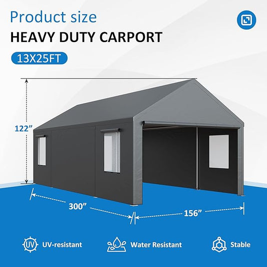 Polar Aurora 13x25 FT Carport, Carport Canopy, Heavy Duty Car Port with 2 Side-Opening Door & Roll-Up Windows, Portable Garage for Car, Truck, Boat, Motorcycle