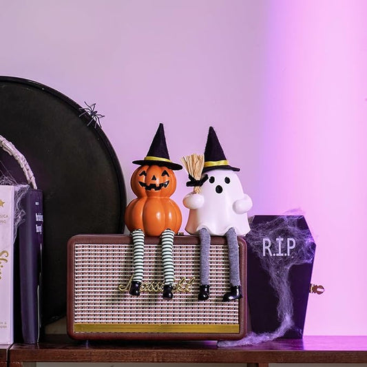 WDS WONDROUS Halloween Decoration-2 Pack Ghost Figurine & Pumpkin Statues for Indoor Mantle Shelf Sitters Table Decor, Cute Resin Pumpkin Ghost Sculpture with Hats, Legs and Broom, Spooky Gift