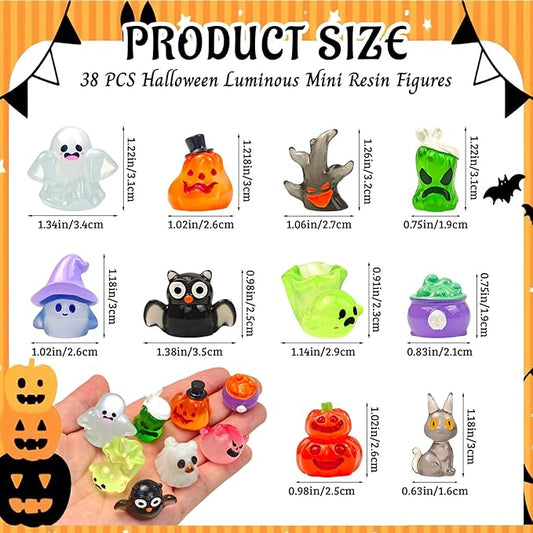 38 Pcs Halloween Luminous Mini Resin Figures Glow in The Dark Tiny Little Pumpkin Ghost Skull Miniature Figurines Bulk for Halloween Party Micro Landscape Fairy Garden Decor