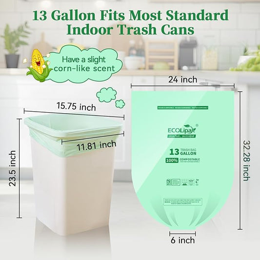 ECOLipak 13 Gallon Compostable Trash Garbage Bags, 100 Count (2 Rolls) Biodegradable Heavy Duty Bathroom Kitchen Trash Bags for Home/Office, US BPI ASTM D6400 and OK Compost Home Certified